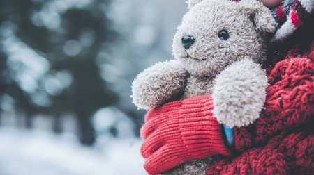 Child Holding a Plush Groundhog in Winter Wonderland. Concept of Groundhog Day Celebration, Childhood Innocence, Seasonal Traditions. Copy space.
