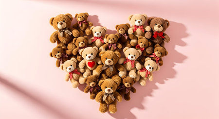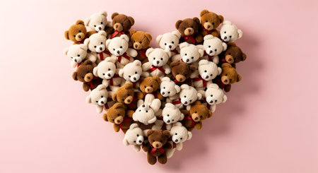 Valentine's Day concept. Teddy bears in heart shape on pink background.