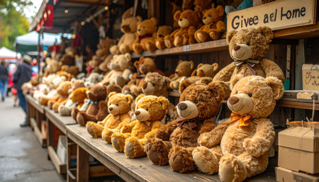 Heartwarming wide shot of a Teddy Bear Adoption booth at a fair, with rows of plush bears sitting on shelves