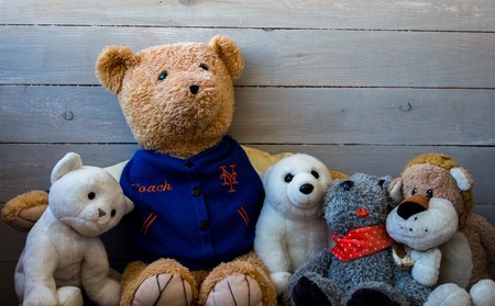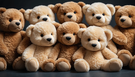 A group of plush teddy bears, each with unique features and colors, are gathered together on a dark background. Their soft, furry bodies and sweet expressions evoke a sense of warmth and comfort. The teddy bears are arranged in a casual, playful manner, suggesting a sense of camaraderie and togetherness.