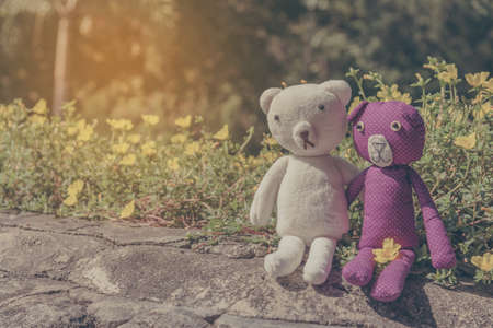 vintage tone image of two bear dolls sit in the garden with flower bed in background