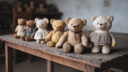 A charming display of vintage teddy bears arranged on a rustic wooden table, evoking nostalgia and warmth; perfect for capturing the essence of childhood and handmade craftsmanship.