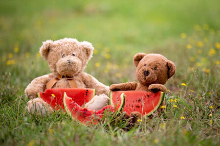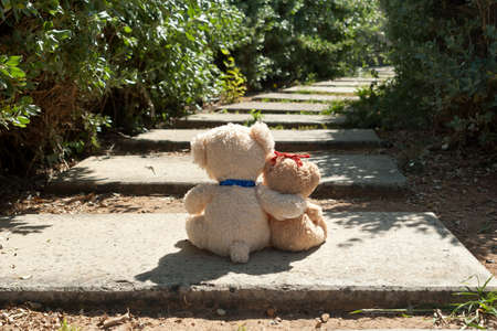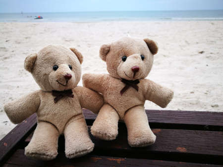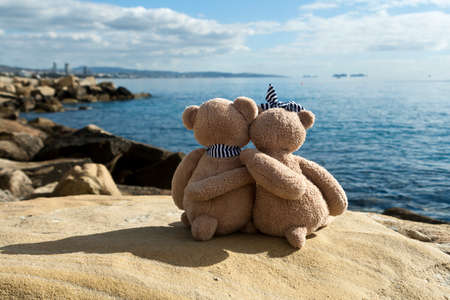 Two teddy bears sitting sea view. Love and relationship concept. Sunlight in the summer.