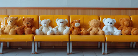 A Row of Teddy Bears Sitting on a Yellow Bench