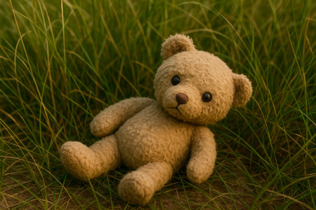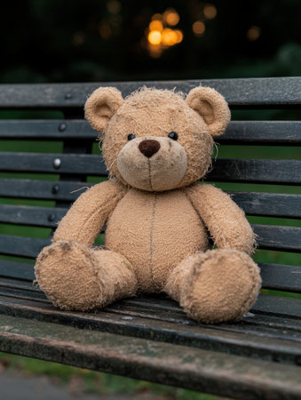 Classic teddy bear with button eyes, sitting alone on an empty wooden bench generative ai