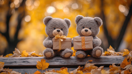 Two cuddly teddy bears sit on a bench, holding small gift boxes amid vibrant autumn leaves, exuding warmth and friendship.