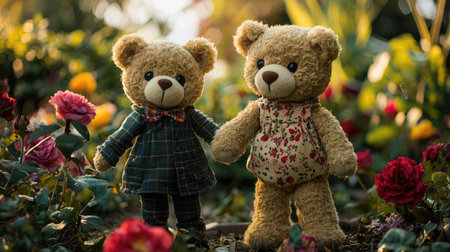 Two cute teddy bears in colorful floral surroundings, exuding charm and warmth, perfect for a whimsical garden setting.