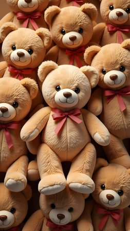 Closeup of a large group of cute smiling teddy bears looking at camera, full frame, background. Generative Ai