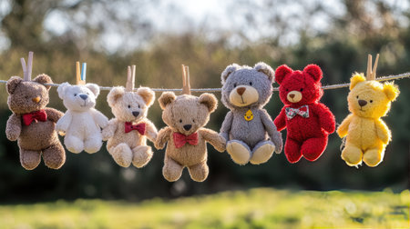A delightful scene showcasing a variety of teddy bears hanging from a line, set against a beautiful outdoor backdrop. Perfect for capturing childhood joy.