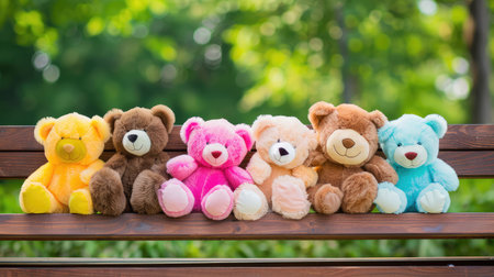 A vibrant group of plush teddy bears displayed on a wooden bench, surrounded by lush greenery, capturing a serene outdoor moment filled with childhood joy.