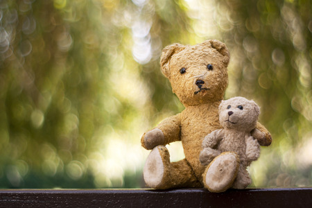 Soft focus Two Happy teddy bear sitting next to window with morning light shining, Cute sofr toys brown and white bear sitting together on sunny day spring or summer, Concept for Valentines day, Mother day or Father day background