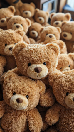 Teddy bears background. A lot of brown soft toys. Generative AI.