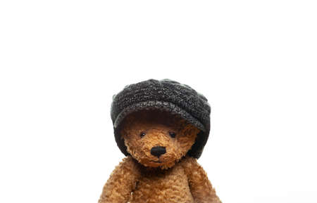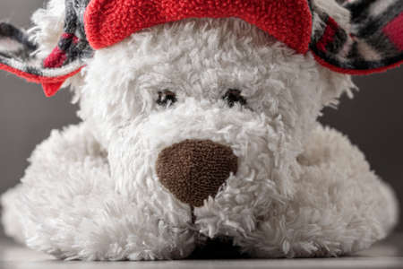 Teddy bear in a red scarf and a black baseball cap. baby plush toy