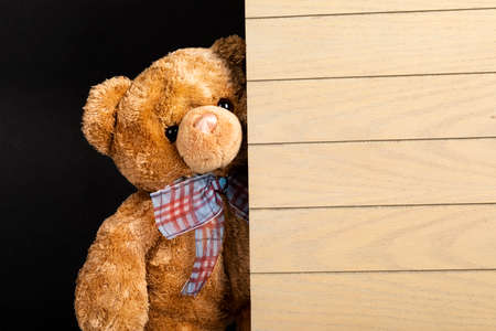 Plush bear with book and mug against logs background. Copy space for text. Education background.