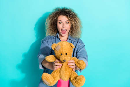Photo of surprised funky lady give you fluffy soft toy bear wear jeans jacket isolated turquoise color background