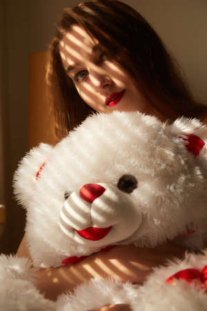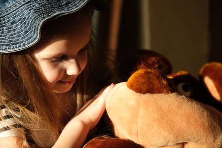 Adorable little girl with his teddy bear friend at home on sunset, nice soft light