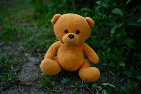 A plush teddy bear with vibrant orange fur is placed on the ground amidst lush green grass and plants enjoying the sunny atmosphere of a peaceful garden.