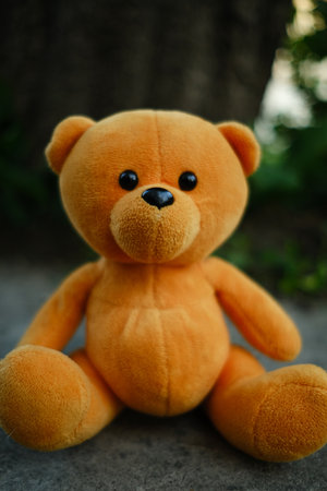 Smiling Teddy bear best friends toy for kids. Adorable Fluffy Brown Teddy Bear happy in green park. Happy fun friend fluffy cute toy doll sitting at garden. Stuffed Toy for kids Family childhood