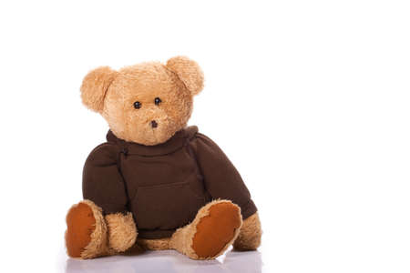 A fluffy brown bear doll in blue and white t-shirt with wooden background