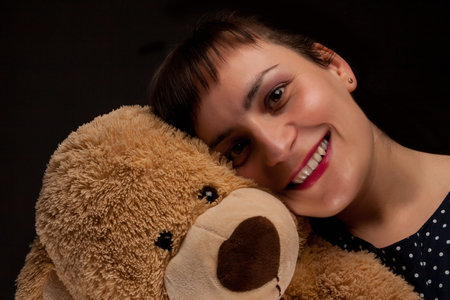 cheerful curly young woman holding teddy bear. concept of present and happiness