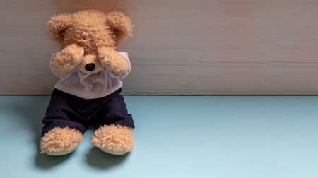 Child abuse, domestic violence concept. Teddy bear sitting alone on blue floor in an empty child room, covering eyes,