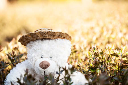Vibrant outdoor photo of teddy bear sitting on the yard at the park with the white flower and green grasses