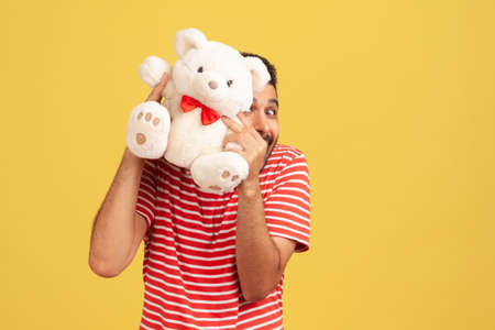Funny playful man in striped t-shirt having fun hiding behind white fluffy teddy bear, making present, wishing happy holidays. Indoor studio shot isolated on yellow background