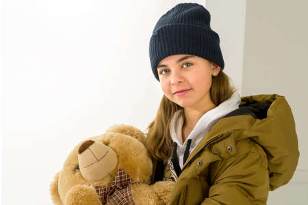 teenage girl in ethnic white embroidered shirt, with brown curly hair, sits hugging teddy bear, stretching her hand forward. concept no to domestic violence, bullying prohibition, stop gesture