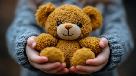 A close-up captures a child's gentle hands holding a cherished teddy bear, conveying love and care.