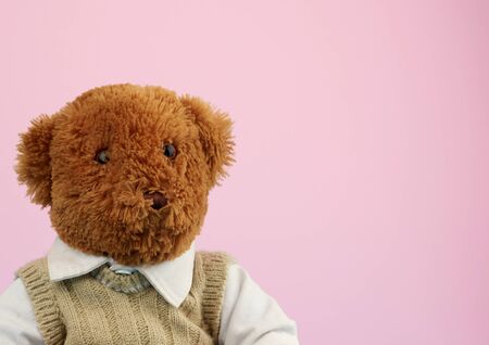 cute little brown teddy bear, toy is sitting on a pink background, close up, copy space