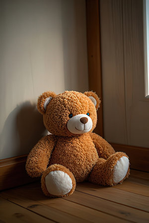 Teddy bear wating alone beside the window with warm sun flare as lonely or happy childhood concept.