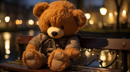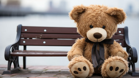 Classic teddy bear with button eyes, sitting alone on an empty wooden bench generative ai