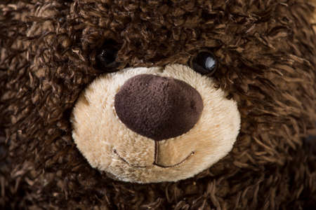 face of the brown toy bear close-up on blurry background