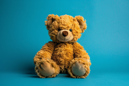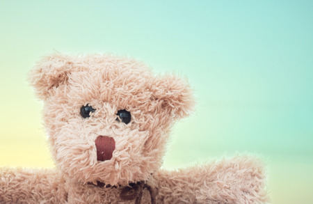 Close up of cute teddy bear. Soft plush toy on blue background