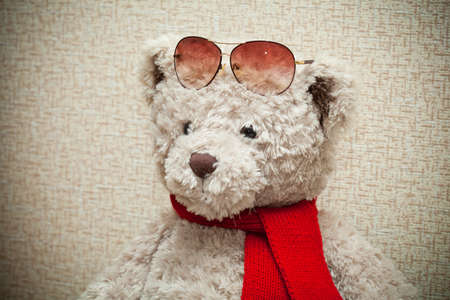 Teddy bear wearing a scarf and sunglasses on his forehead. plush toy