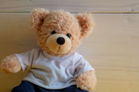Teddy bear on white wood wall background, Kid alone wearing white tshirt in the child room concept