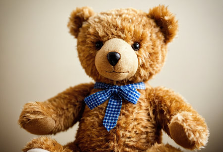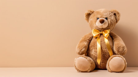 A charming teddy bear with a yellow bow sits against a soft beige backdrop, symbolizing comfort and childhood innocence, perfect for cozy settings.