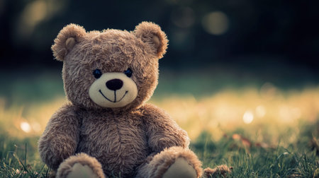 A cuddly teddy bear sits peacefully in a grassy field, bathed in the warm glow of the setting sun.