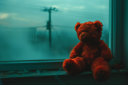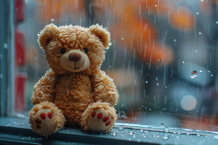 Teddy bear sitting on the windowsill with raindrops on the glass