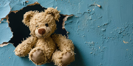 tender teddy bear, leaning against a solid wall generative ai