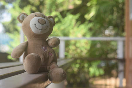 Cute teddy bear sitting on wooden bench