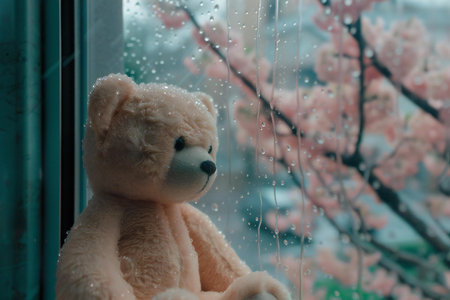 Teddy bear with pink cherry blossom behind the window in rainy day