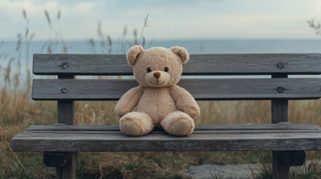 A cute teddy bear sits on a wooden boardwalk, surrounded by a serene atmosphere with cloudy skies, perfect for evoking childhood memories and emotional warmth.