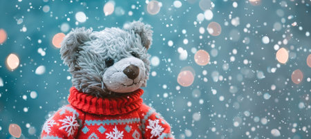 Gray plush bear in a red sweater with snowfall. Concept of winter season, festive decoration, cozy atmosphere, Christmas. Copy space.