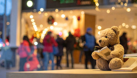 Street level view of a teddy bear reading a tiny book in a bookstore window, blurred holiday shoppers in background