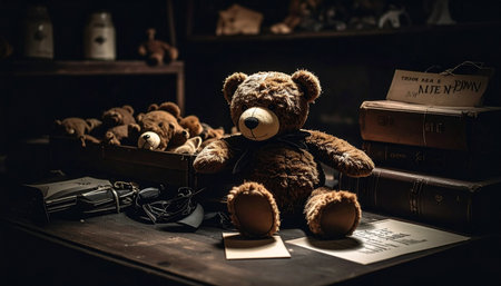 A soft and cuddly teddy bear with a warm smile sitting in front of a vintage wall, gently lit by natural light. Generated by AI.