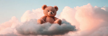 A soft teddy bear relaxes on a fluffy cloud, surrounded by a pastel evening sky filled with gentle hues as day transitions to night.