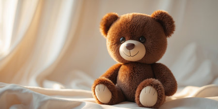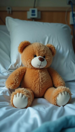 A soft teddy bear sits on a hospital bed, providing comfort and hope to a child in recovery. The warm tones of the bear contrast with the serene environment, enhancing the atmosphere. Generative AI.