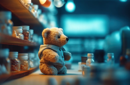 Vintage teddy toy in a gray jacket and a tag behind the store counter. Retro teddy bear behind the counter at the pharmacy. Beautiful blurred background with lamps and shelves. Created using generative AI.