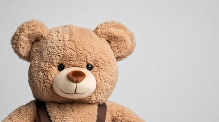 A close-up shot of a teddy bear with a light brown fur and a friendly expression, perfect for childrens content.